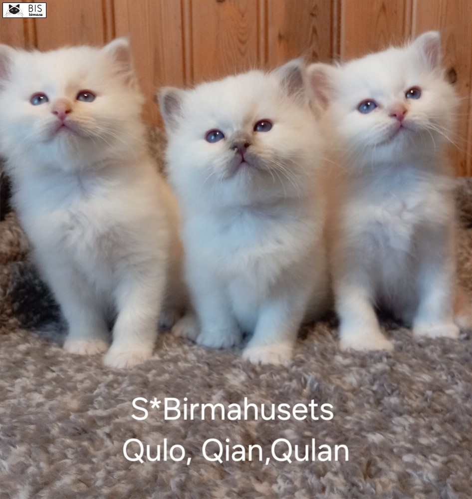 Kattungarna heter Birmahusets Qulan, Qulo och Qian.Vill ni veta mer om dom så är ni välkomna att höra av er eller hälsa på.