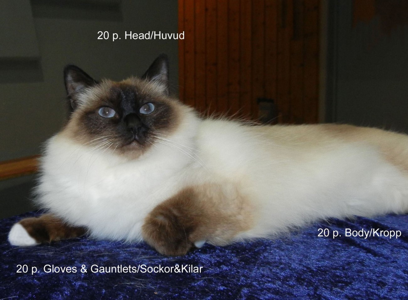 Colour: Shows all characteristics known from the Siamese pointed cats, but all four feet are white (gloves). The points include the face, ears, legs, tail and genitals. The points shall be even and in good contrast to the body colour. Body colour: refer to the General Part for Siamese pointed cats. Only in adult cats are the colour of the points and the body colour fully developed.